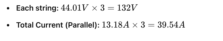 - Voltage Matching: The panels operate at 44.01V (Vmp).